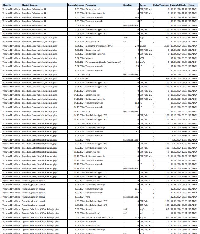 Seznam in opis rezultatov preizkušanj vzorcev pitne vode za leto 2024 S tem je prikazana kvaliteta in ustreznost našega vodnega vira in tudi kaj to pomeni za naše zdravje.