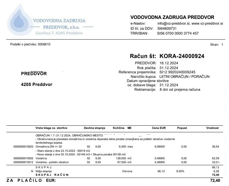 V naslednjih dneh, pa vse do konca decembra, bo Vodovodna zadruga Preddvor začela izdajati letne obračune/poračune na področju, kjer je kot izvajalec obvezne gospodarske javne službe oskrbe s pitno vodo v občini Preddvor za naselja Nova vas, Preddvor, Hrib, Breg ob Kokri, Zgornjo, Srednjo in Spodnjo Belo ter spodnji del Tupalič. Računu bo priložen tudi UPN QR nalog, katerega bo poleg standardnih šalterskih mest (pošte, banke, trgovine) možno plačati tudi preko modernih elektronskih inštrumentov (e-banke).